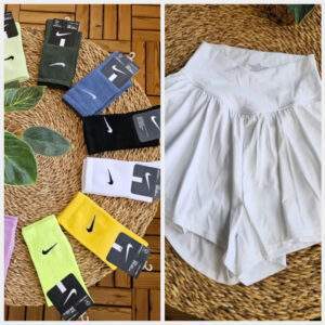 شورتک ورزشی زنانه زاپدار سیملس سایز M قرمز و جوراب اسپورت نایکی ساق بلند رنگی: ترکیبی ایدهآل برای ورزش و استایل روزانه شما