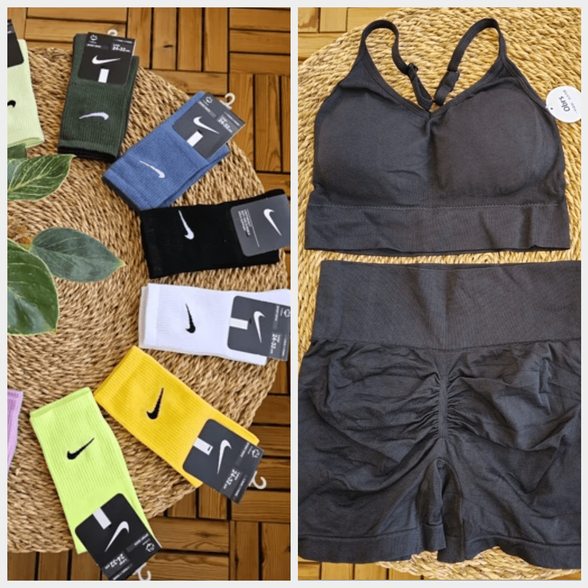 ست نیمتنه و شورتک ورزشی زنانه سیملس فری سایز طوسی و جوراب اسپورت نایکی: ترکیبی ایدهآل برای بانوان فعال 🤩